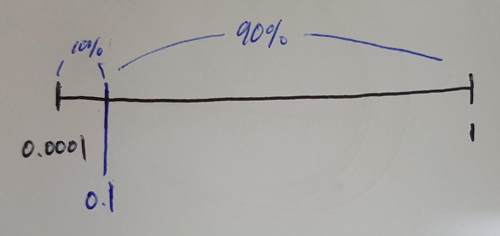 We are searching for the hyperparameters α, the learning rate. If we draw the number line from 0.0001 to 1, and sample values uniformly at random over this number line, we will get 90% of the values between 0.1 and 1. And only 10% of the resource to search between 0.0001 and 0.1.