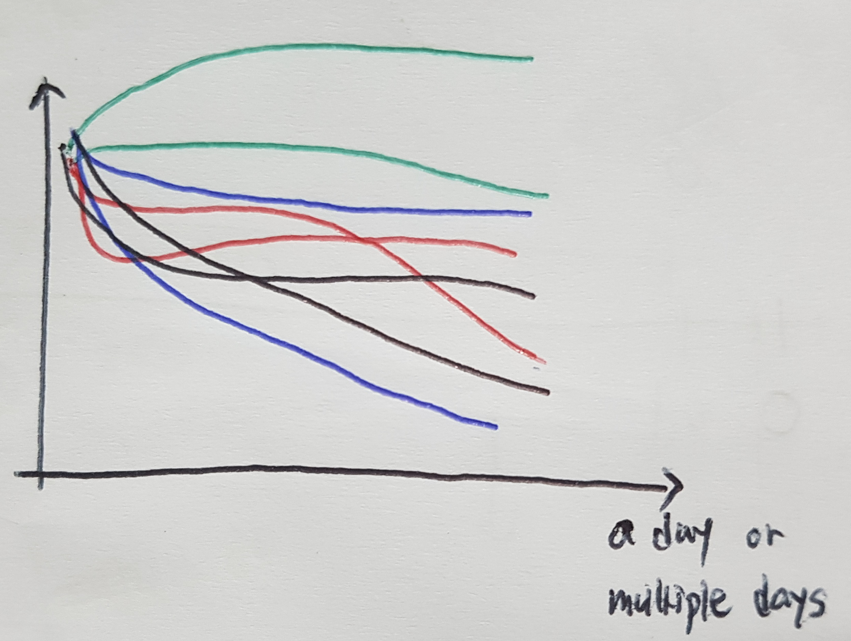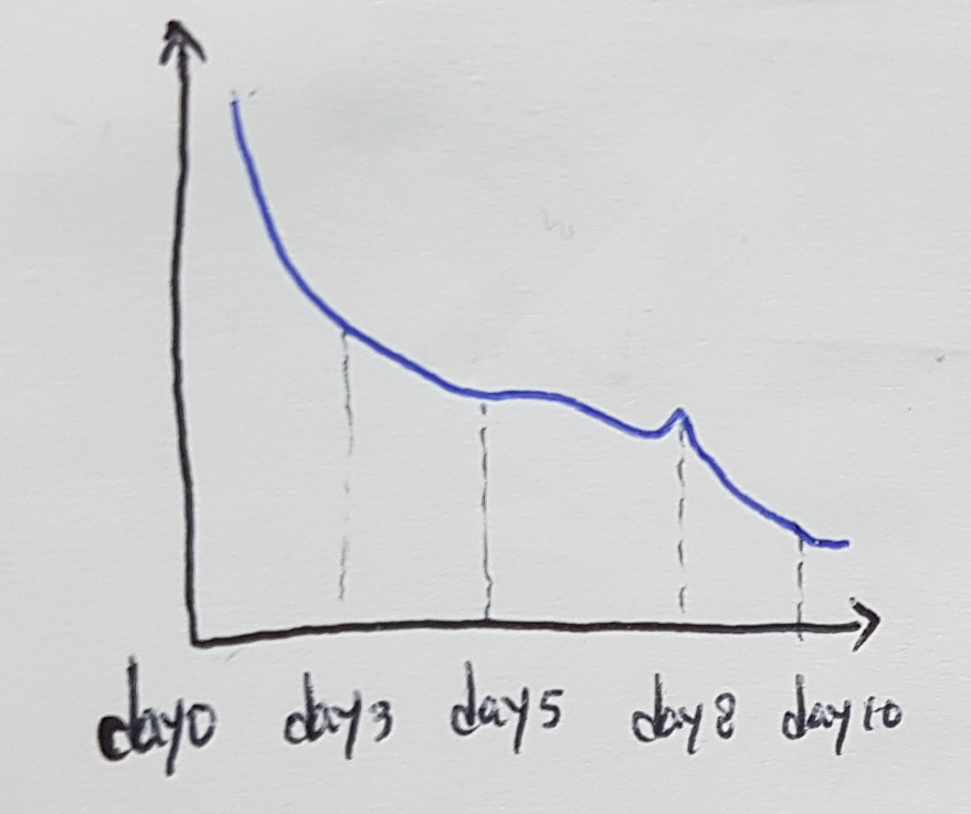 We gradually watch the learning curve, it might be the cost function J or dev-set error or something else. Then, at day 3, we might try increasing the learning rate a little bit and see how it does. At day 5, we will fill the momentum term a bit or deacress the learning rate a bit. At day 8, we found the learning curve surge. So, we might go back to the previous day's model.