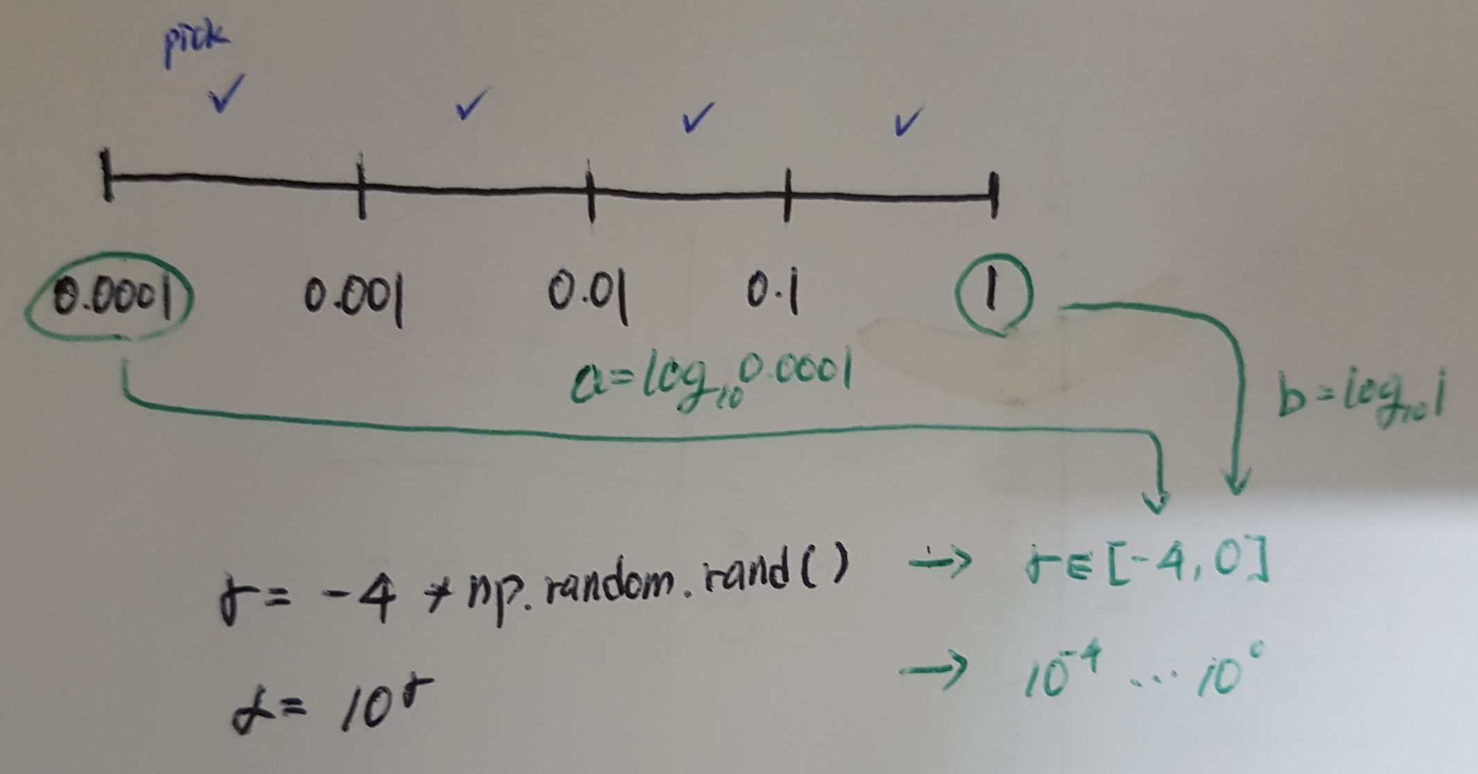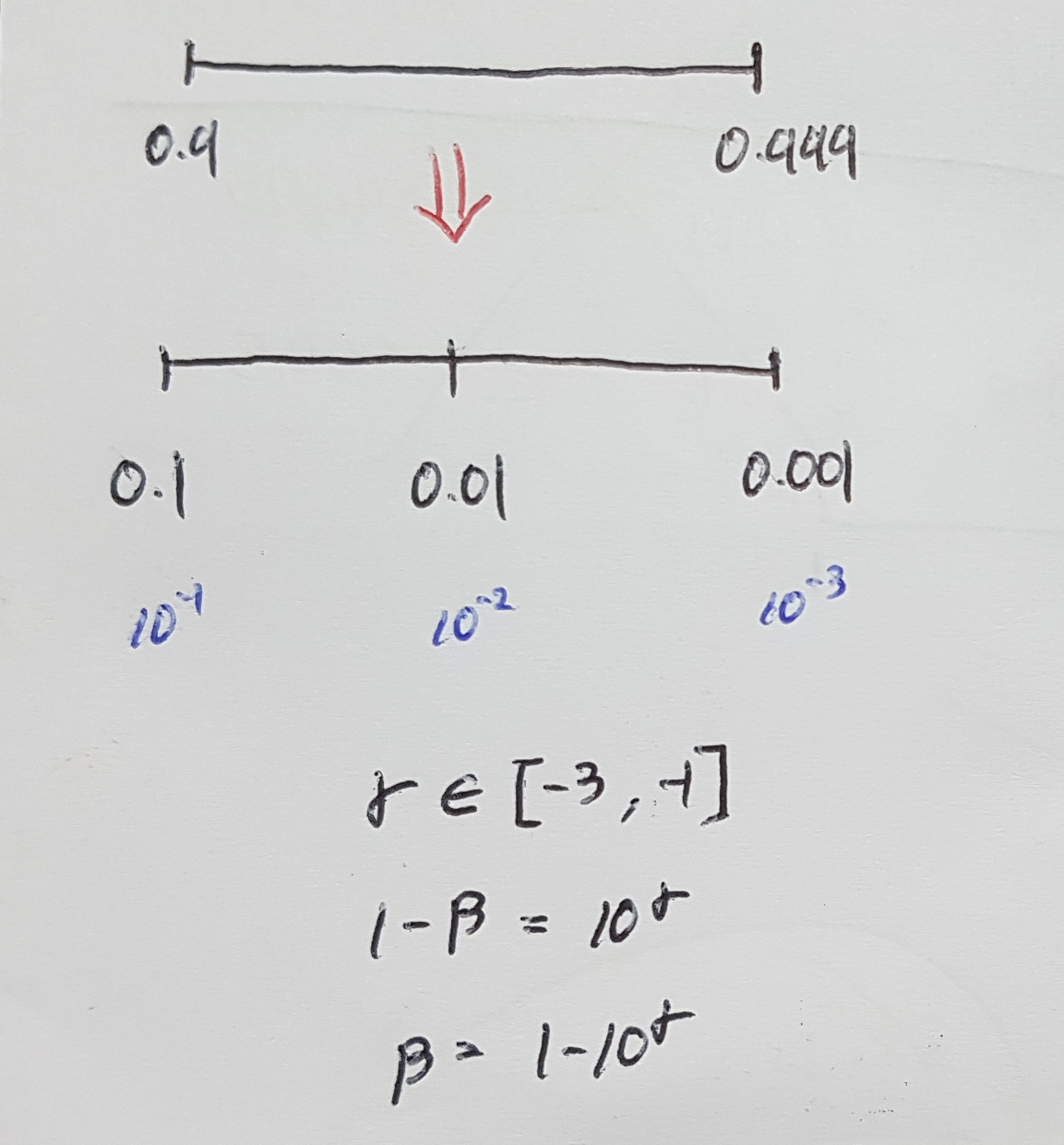 Instead of using a linear scale(above process), it seems more reasonable to search for hyperparamters on a log scale. We sample uniformly on this type of logarithmic scale at random.
