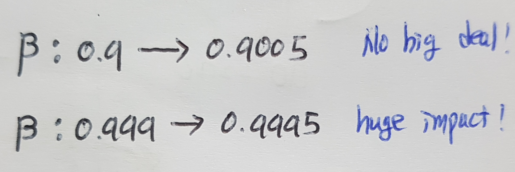 If β goes from 0.9 to 0.9005, it is no big deal. This is hardly any change in our results. It is averaging over roughly 10 examples before and after. Equation: 1/(1-β)