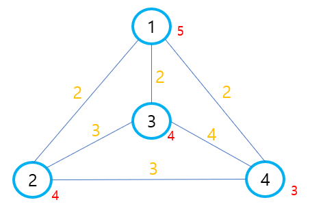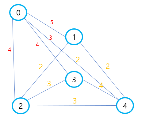 이제 가상의 노드 0으로 연결하겠습니다. 우물을 파는 비용인 붉은색은 그대로 0번과 연결된 간선의 비용이 됩니다. 이제 일반전인 MST 알고리즘을 적용하면 됩니다.