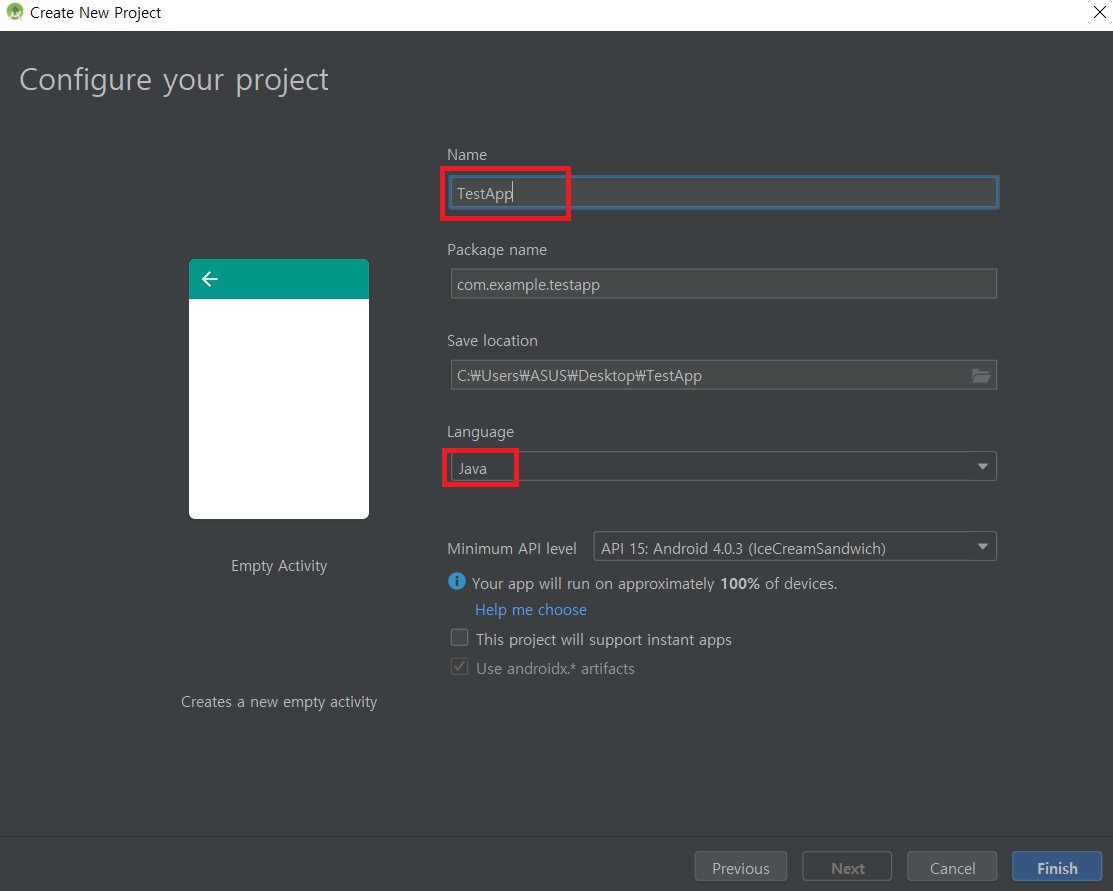 그리고 프로젝트 이름을 정하고, Java를 선택합니다.