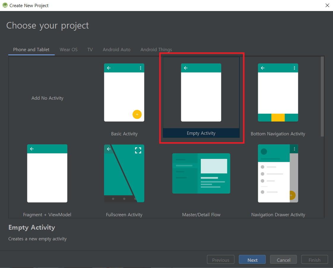 안드로이드 프로젝트를 생성하겠습니다. Empty Activity를 선택합니다.