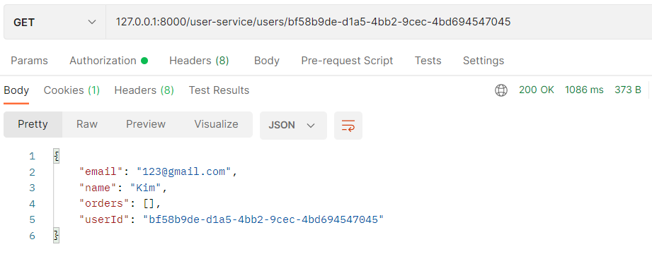Order Service를 켜고 테스트 해보니, 아래와 같이 정상적으로 나오네요.