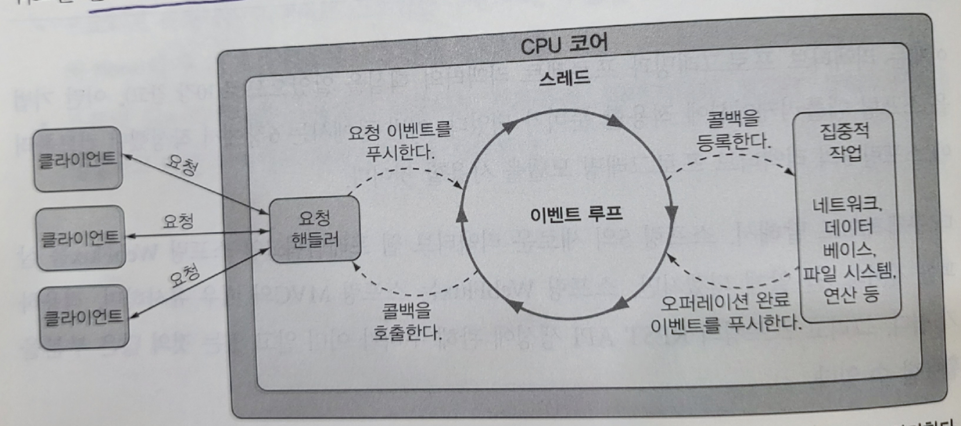 비동기 웹 프레임워크는 적은 수의 스레드로 높은 확장성을 성취합니다. 이벤트 루핑(event looping) 기법으로 한 스레드당 많은 요청을 처리할 수 있습니다. 이벤트 루프에서는 모든 것이 이벤트로 처리됩니다. 이벤트 루프는 요청 작업의 콜백을 등록하여 병행으로 처리하게 하고 다른 이벤트 처리로 넘어갑니다. 그리고 작업이 완료되면 완료 작업도 이벤트로 처리됩니다. 결과적으로 적은 수의 스레드로 많은 요청을 처리할 수 있어서 스레드 관리 부담이 줄어들고 확장이 용이합니다.