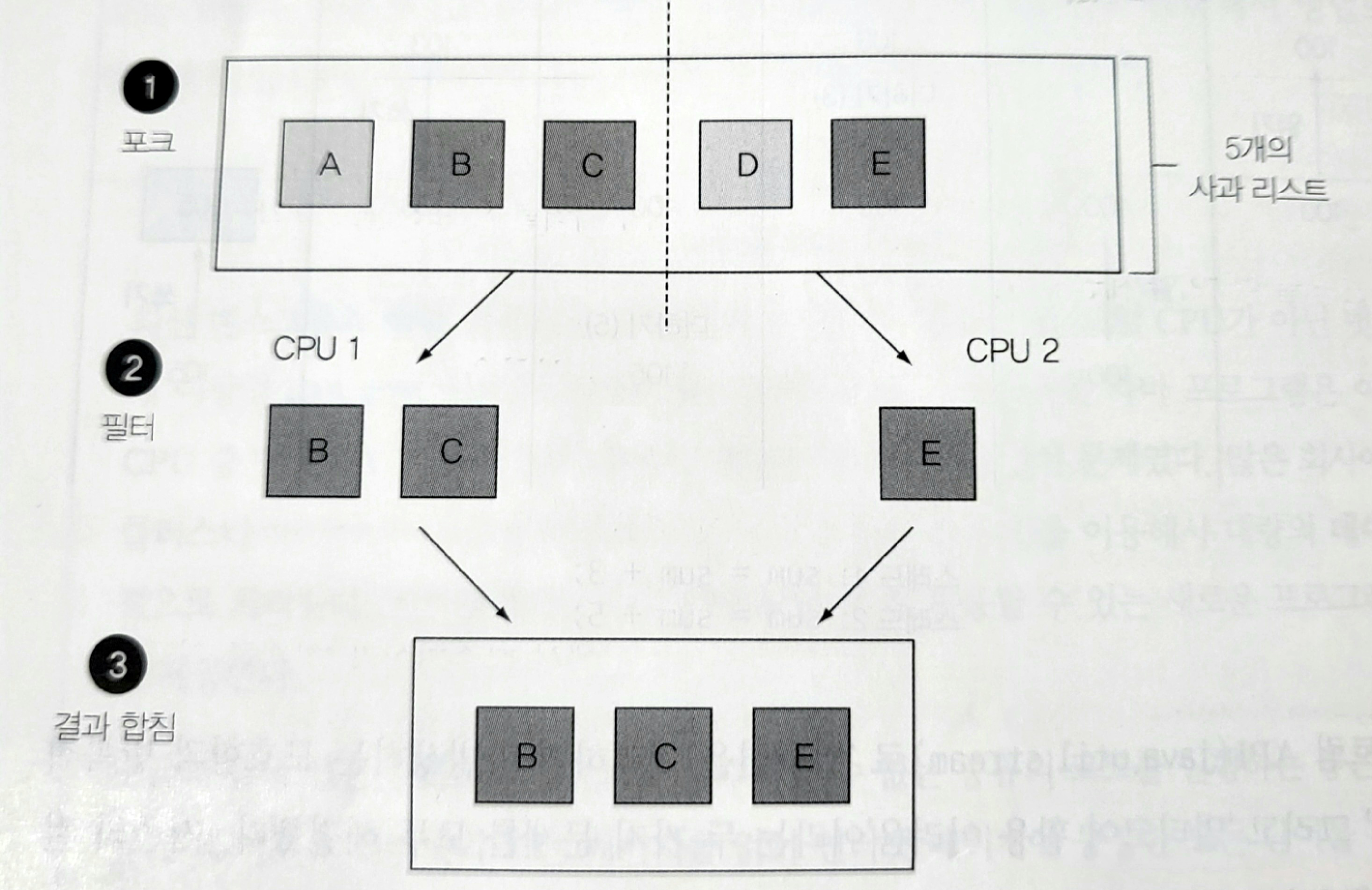 자바 8에서 제공하는 다음 기능은 병렬 처리입니다. 스트림 API를 통해서 멀티 스레드 활용의 어려움 문제를 해결했습니다. 아래 그림을 보면 이해하기 쉬울 겁니다. 5개의 사과 리스트를 필터링하는 것입니다. 2개의 CPU가 있으면, 앞에 3개는 CPU 1이 처리하고, 뒤에 CPU2는 나머지 2개를 처리합니다. 그리고 합치면, 짜잔~ 결과가 나옵니다.