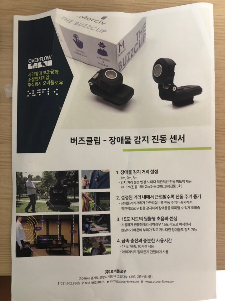 또는 카메라를 지팡이에 달아보려는 시도도 해보았습니다. 1차 면접 심사가 끝난 후에, 복지관장님께서 많은 시각장애인 분들이 지팡이를 사용하는 것은 아니라고 하셨습니다. 저는 시각 장애인분들이 모두 앞이 보이지 않을 거라는 생각을 가지고 있었습니다. 하지만 실제로 앞이 전혀 보이지 않는 맹인뿐만 아니라 흐릿하게 또는 음영만 보이는 사람들도 있다는 사실을 알게 되었습니다. 그래서 모든 사람들이 사용할 수 있도록 하기 위해서 지팡이가 아닌 탈부착형태의 브로치를 만들기로 했습니다.