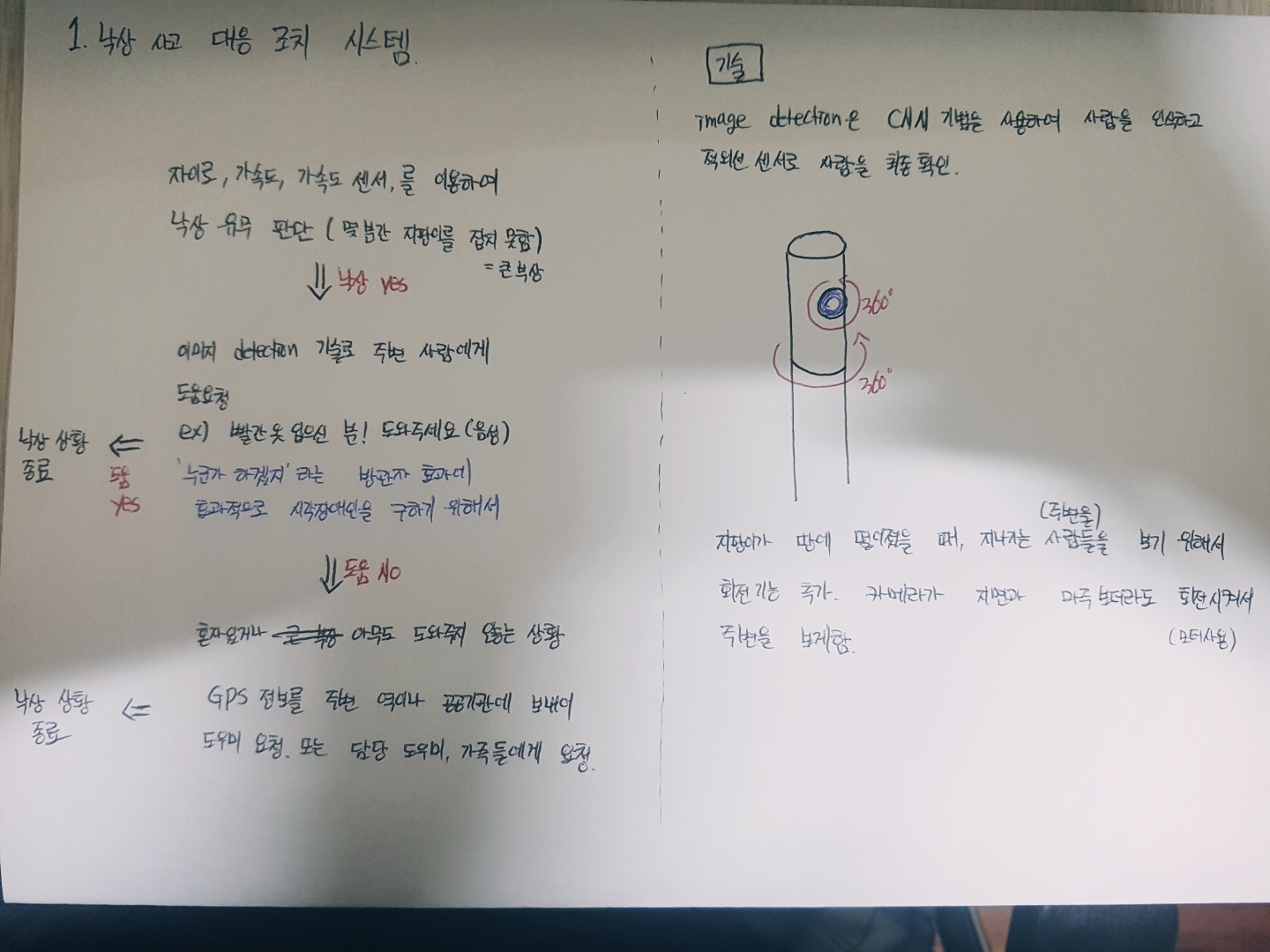 수십 팀 중에서 15팀을 선출했습니다. 서류로 idea와 계획서를 제출하는 방식이었습니다. 저희는 시각장애인 보행에 도움이 되는 어플을 개발할 계획이여서 그러한 내용으로 채웠습니다. 아래 사진은 초반에 어떻게 IoT를 계획하고 어떤 알고리즘으로 낙상 사고를 예방하고 대처할 수 있을지 적어본 글 입니다.