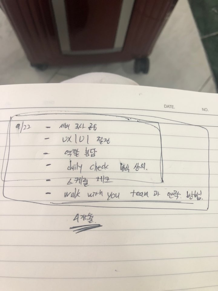 멘토님께서 한 가지 활동을 주셨습니다. 3명이서 함께 모여 캠프같은 합숙을 해보기를 권하셨습니다. 3명 모두 개발 경험이 없고 분야도 달랐기 때문에 같이 있으면서 서로 영향을 주면 분위기와 개발 진행도가 크게 향상될 것이라고 말씀하셨습니다. 그래서 다음 달인 10월에 멘토링이 끝나고 합숙하기로 결정했습니다. 빠르게 하고 싶었지만, 한 친구가 광주광역시에 거주하고 있어서 언제든지 일정을 잡지 못했습니다.