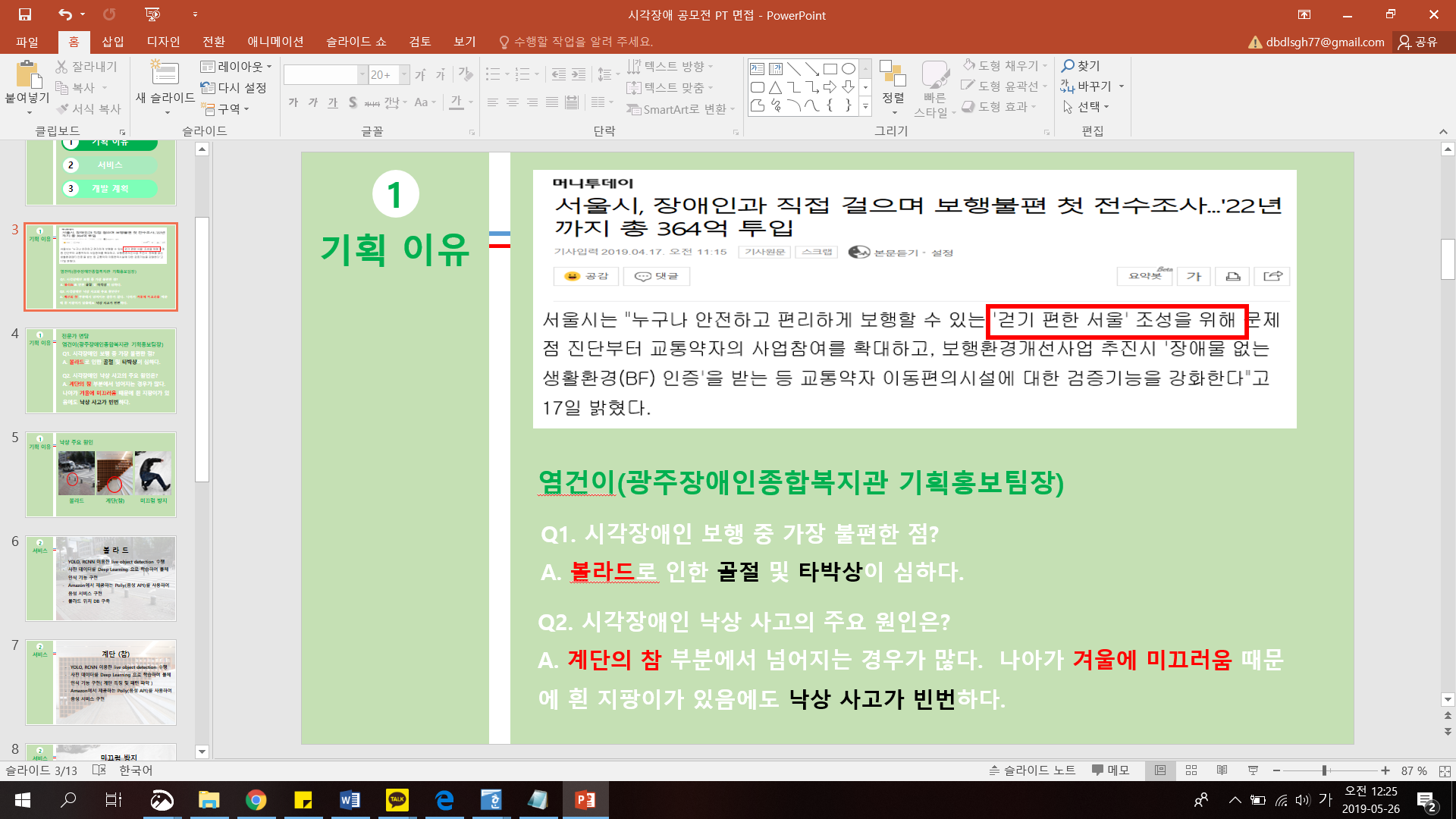 그리하여 총 3번의 수정을 거쳤습니다. 1차 면접심사에서 받은 내용으로 볼라드, 낙상, 계단 사이 틈 중에 볼라드와 낙상을 선택했습니다. 그리고 지팡이 대신에 브로치를 사용하기로 했습니다. 그리고 계속 피드백을 받으면서 수정 보완했습니다.