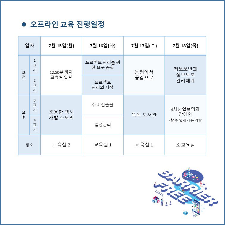 1차가 끝나고 그린라이트와 현대오토에버에서 교육을 해주었습니다. 어플 개발에 대한 전반적인 과정과 필요한 기술, 장애, 장애인을 위한 어플 등에 대한 교육을 4일에 걸쳐서 진행했습니다. 장소는 이룸센터 2층에서 진행됬습니다. 아침 9시에 진행됬는데, 제가 머물고 있는 장소에서 9시까지 여의도로 갈려고 하니 무척 이른 시간에 나와야 했습니다. 색다른 경험으로는 저도 직장인이 된 것 같았습니다. 9시면 출근 시간이여서 직장인들과 같은 지하철을 타면서 출근(?)했습니다. 그냥 보내는 시간이 아쉬워서 책을 읽으면서 갔던 기억이 새록새록 합니다.