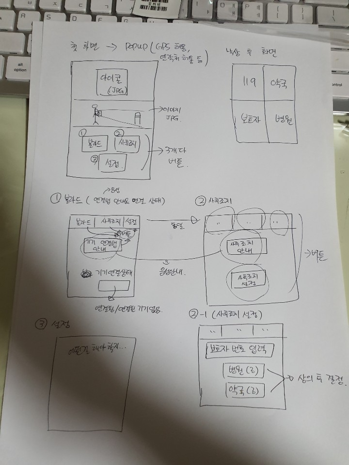 저와 팀장이 기능 개발에 전념하고 있는 동안 다른 친구는 디자인을 맡았습니다. main색은 안전을 상징하는 초록색 계열로 하기로 했습니다. 그리고 화면 간의 이동은 스캐치해서 그려보았습니다. 디자인을 파워포인트로 한다는게 참 신기했습니다. 보면 볼 수록 실력이 대단한 것 같습니다.