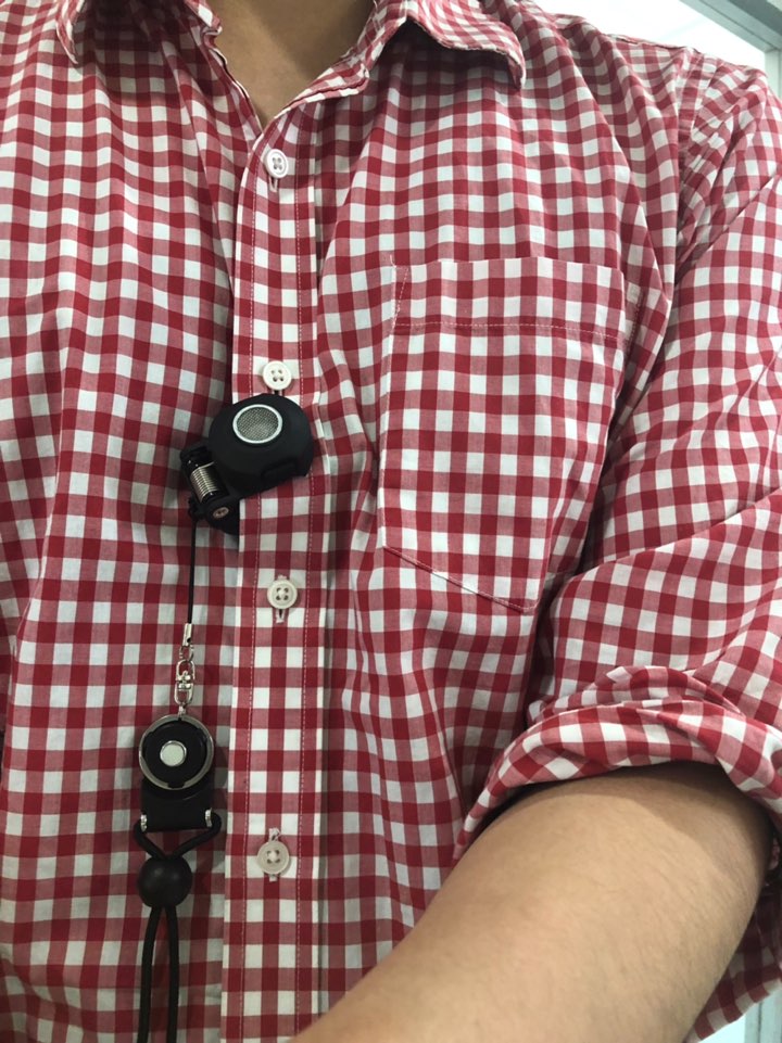 피드백 이외에도 시각장애인들을 위한 여러가지 기구들도 살펴 보았습니다. 아래에 있는 장비는 장애물 감지 진동 센서입니다. 감지할 거리를 설정하여 사용자 앞에 물체가 있으면 진동으로 알려줍니다. 이런 형태로 옷깃에 붙여서 카메라를 사용하기로 했습니다.
